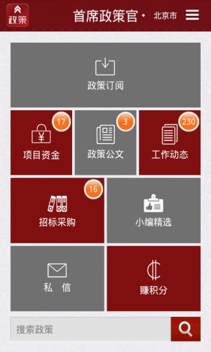 首席政策官是中国首个整合各级政府最新扶持政策的手机内容应用, 是企业“及时、全面获取政府政策类资金、资源“的第一利器,是中国含金量最高企业手机应用。