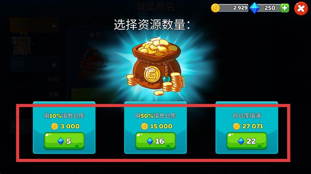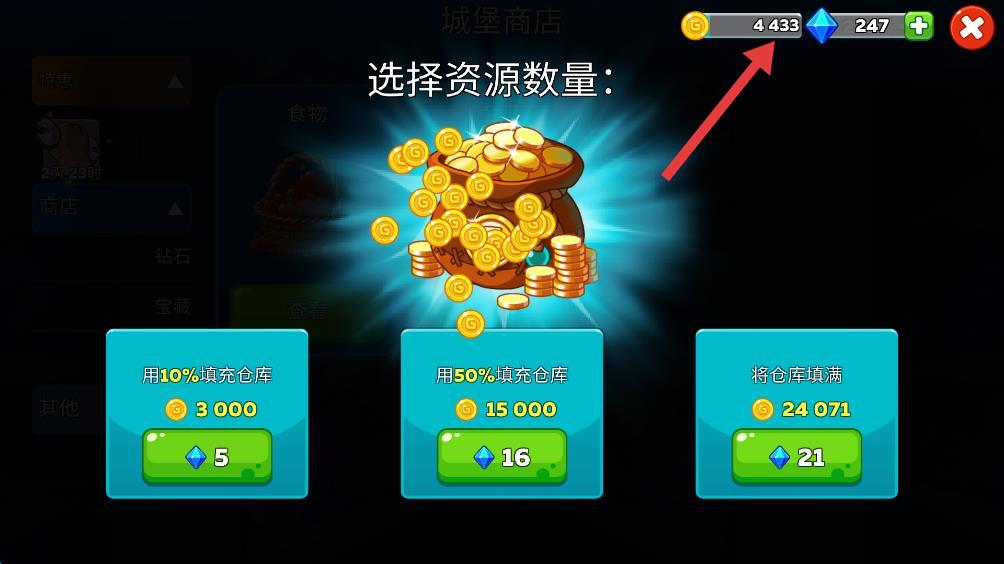 3、进入城堡商店的界面,可以选择用钻石购买金币。