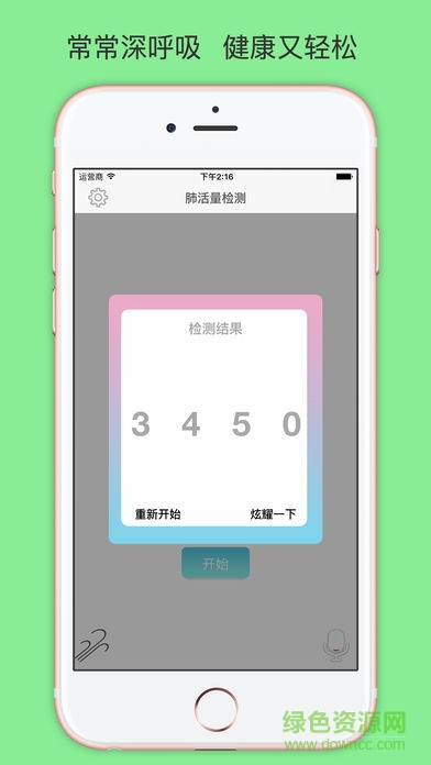 肺活量测试app是一款全民测肺活量的软件,通过麦克风快速了解的你的肺活量,还能和好友一起PK,更有丰富积分任你兑换实物奖励哦,一起来绿色资源网试试吧!