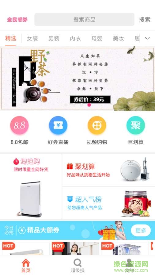 【巨划算】 聚划算活动基础上,还能再领券,享折上折优惠。更有淘抢购、超人气榜版块。