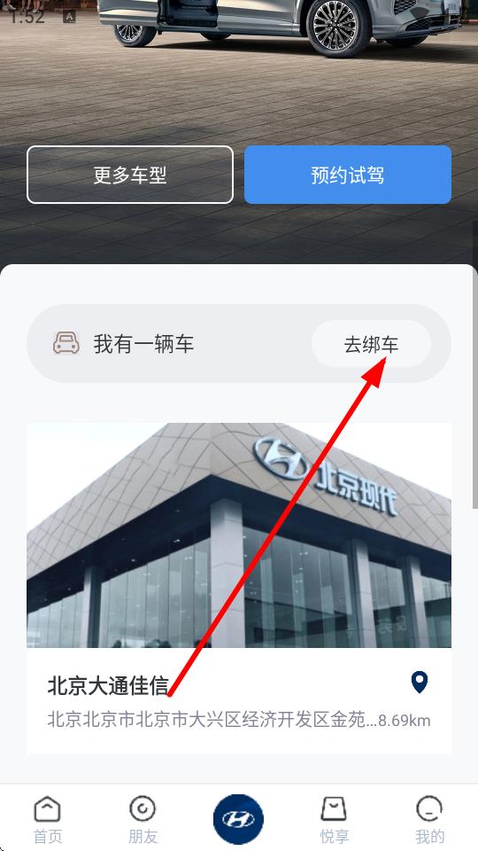 1、打开北京现代app,在首页点击预约试驾选项,进入预约试驾页面。