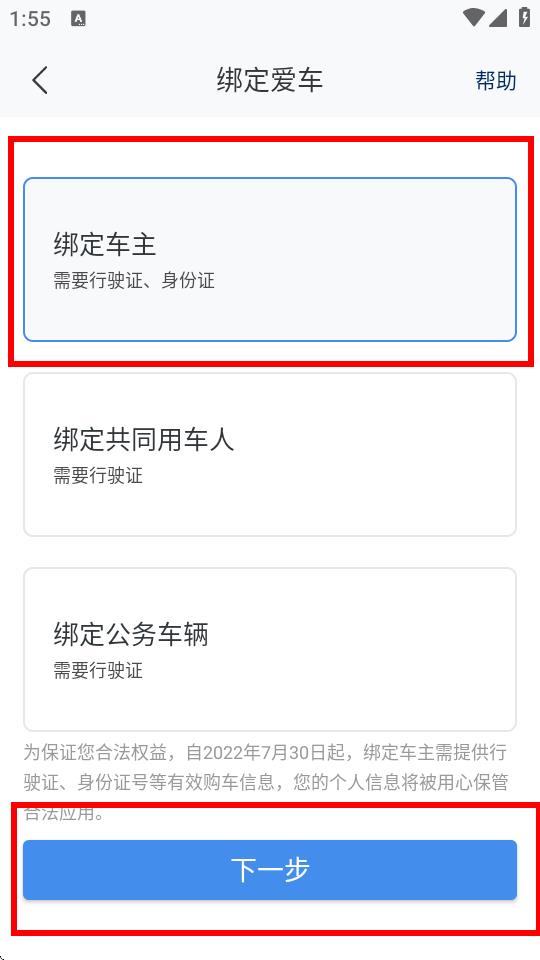 3、进入绑定爱车界面,选择绑定身份类型,绑定车主、选择后点击下一步。