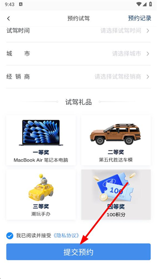 3、确认信息无误后,勾选隐私协议,点击提交预约按钮完成试驾预约。