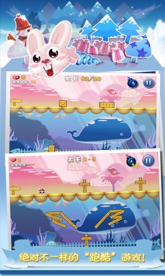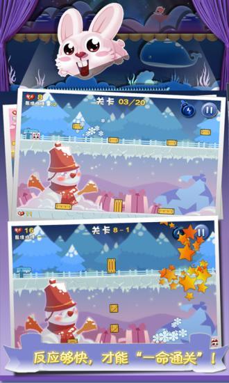 游戏难度虽然很高,但操作却很简单,你只要点触屏幕就能帮助小强跳起来,持续按着屏幕能帮它连续跳跃。游戏分为四个世界:静止、机关、运动、圣诞,每个世界都惊喜不断,充满挑战。游戏中还有特殊“雷”道具供你使用,它可以帮助兔小强消灭前面一个无法跳过的障碍!