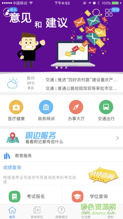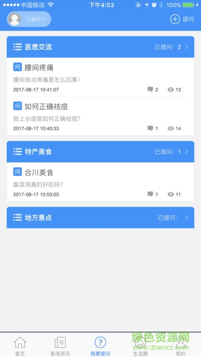 可以提交用户绿色资源网的相关问题,包括医患交流、特产美食、交通出行、生活等模块。同时还可以展示用户经过审核后的评论。