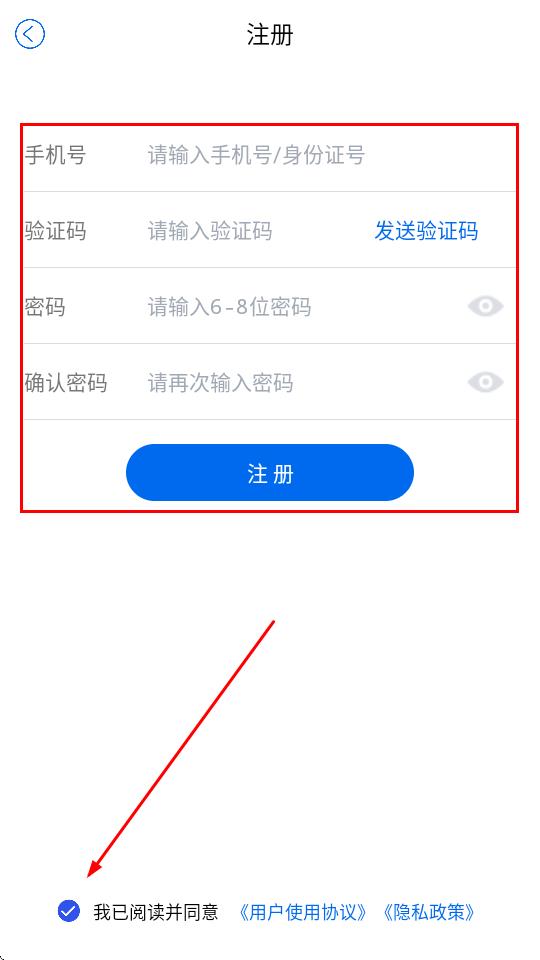 4、在注册页面,输入手机号、输入验证码,设置密码,再次确认密码,勾选我已阅读并同意用户使用协议隐私政策,点击注册。