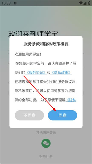 1、打开师学宝,在隐私政策弹窗中,点击同意。