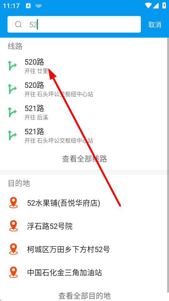 2、在搜索框中输入要查询的公交线路,比如输入520,选择对应的公交线路。