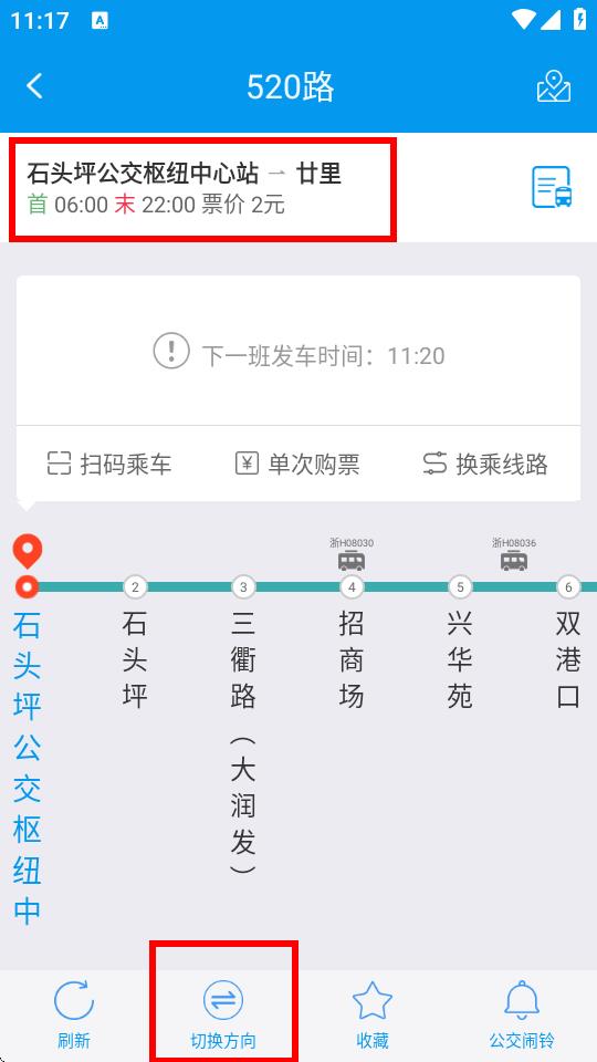 3、进入公交线路详情页面后,点击底部的切换方向,可查看不同行驶方向的公交信息。