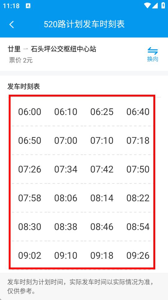4、在公交线路详情页面中,找到并点击进入发车时刻表页面,即可查看公交车的发车时间段,不过要注意,发车时刻为计划时间,实际发车时间以实际情况为准。