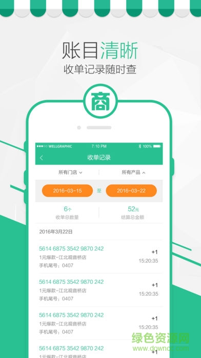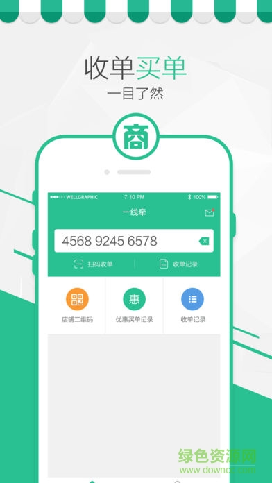 优积付商家版app是为商家用户推出的智能化应用。使用本软件可以随时随地管理门店,查看商品进销存数据,进行门店账单查询。支持二维码扫描收单操作。服务更加人性化!欢迎来绿色资源网下载使用。