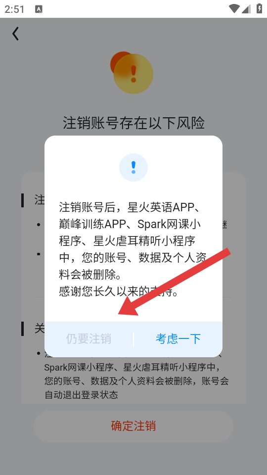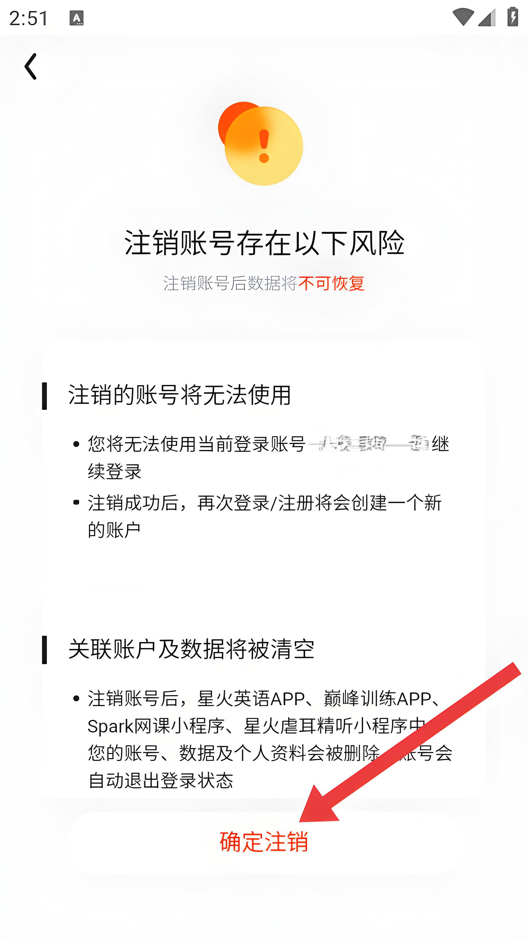 3、在注销账号风险提示页面,点击确定注销,进入最终确认环节。