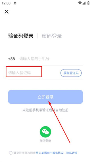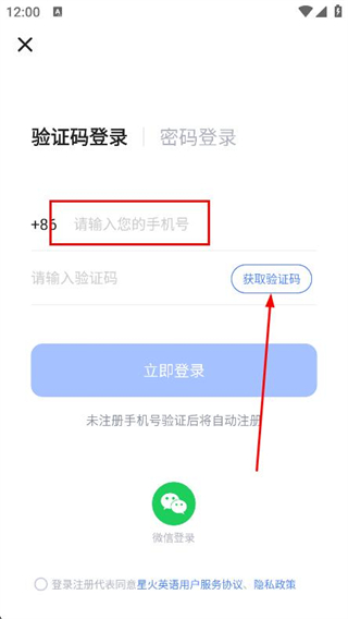 3、在登录页面,输入手机号,点击获取验证码。