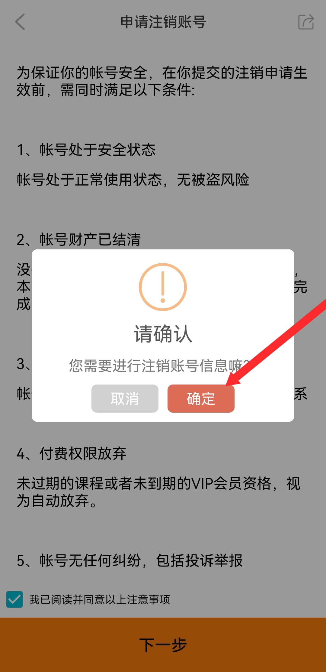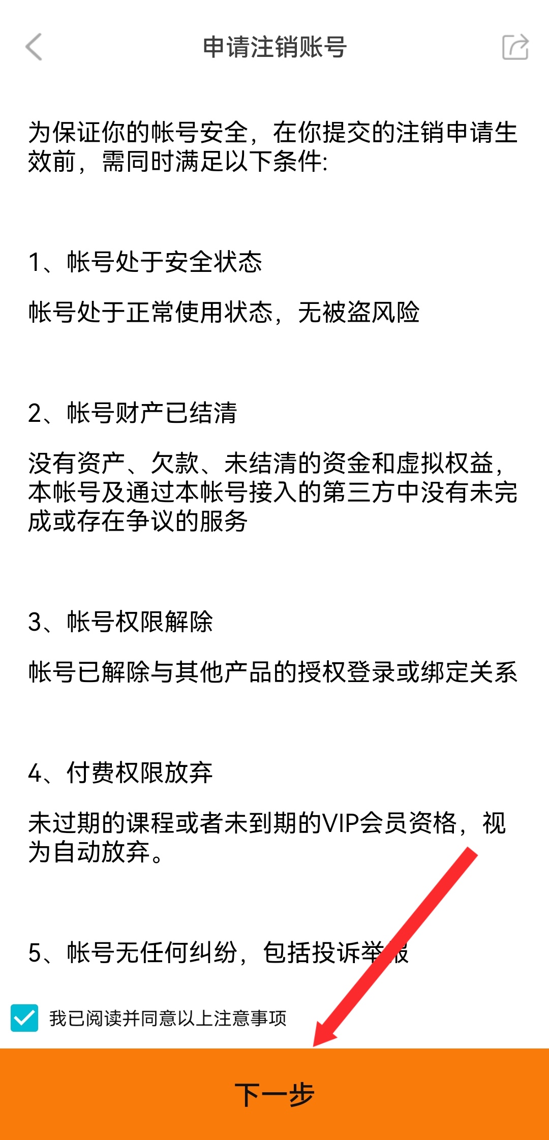 3、在申请注销账号页面,勾选注意事项后点击下一步,进入确认环节。