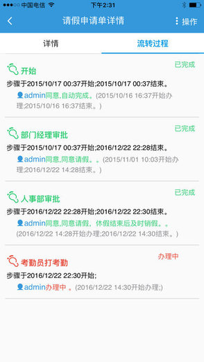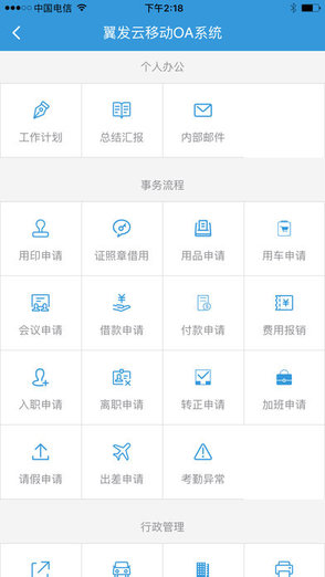 2.移动OA模块功能包括工作计划、总结汇报、内部邮件、通讯录管理;包括离职申请、费用报销、入职申请、用品领用申请、考勤异常申请、证照章借用申请、转正申请、用印申请、出差申请、借款申请、会议申请、用车申请、加班申请、请假申请、付款申请等业务流程。