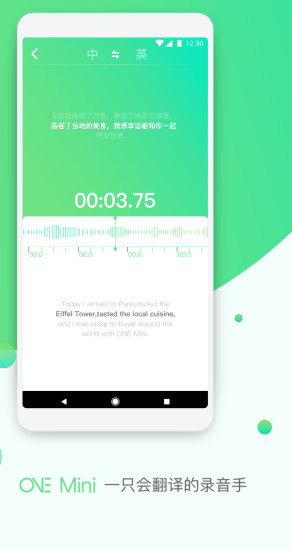 ONE Mini 多语言助手 APP 应用 ,是一款配合 ONE Mini硬件使用的配套软件,ONE Mini是一款口袋里的语言产品, 集 AI 翻译, 人工翻译, 录音转写翻译, 无线音乐于一体, 解决跨语言交流障碍, 覆盖多场景.