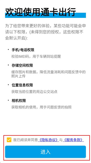 1、打开通卡出行,勾选我已阅读并同意相关协议的选项,点击界面中的进入按钮。