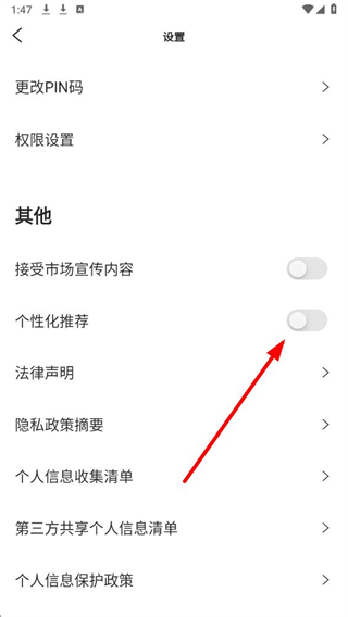 3、在界面找到个性化推荐选项,点击个性化推荐右侧的开关按钮,即可启用该功能。