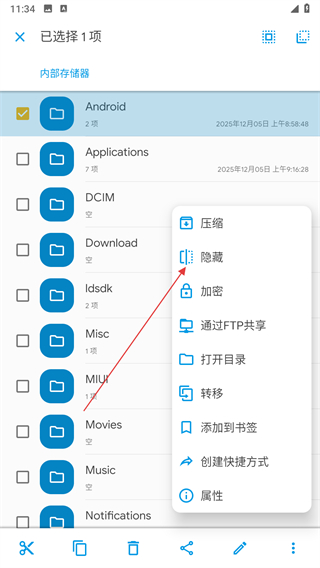 3、在弹出的功能菜单中,找到隐藏选项并点击。