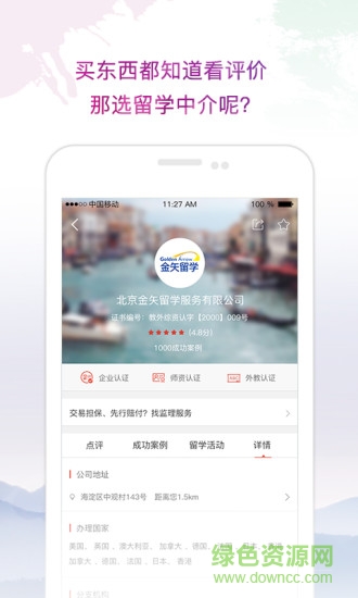 3.提供各留学中介详细信息包括:中介详情、资质,用户点评,成功案例等信息,便于你对意向留学中介进行综合评估分析。