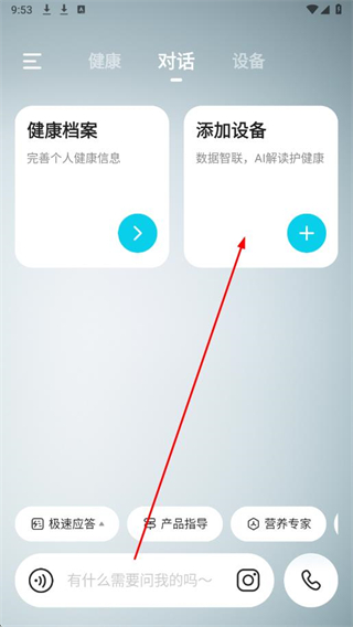 1、打开鱼跃健康管家APP,在对话页面点击添加设备。