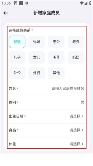 2、在新增家庭成员页面,选择对应亲属关系,并填写姓名、性别等必填信息。