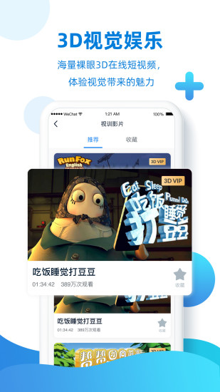 产品与中山大学中山眼科中心联合研发,家庭化的专业视觉健康管理平台,通过移动端+3D护眼膜+视觉健康云APP的方式,实现在家完成专业的视功能筛查、建立个人视觉健康档案、视觉健康异常预警、智能诊断并推送专业解决方案。其中3D护眼膜与3D显示算法的结合,使一部普通的手机具备了双眼分视的功能,在不影响2D显示的情况下,兼容左右分视的3D功能。结合该项功能能够让普通移动设备实现双眼视功能筛查与训练。