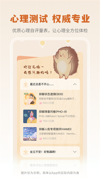 本软件提供国际权威的抑郁症他评量表测试题,可以帮助用户筛查自己的抑郁、焦虑倾向,同时可以给出针对用户抑郁、焦虑情况的专业治疗建议。