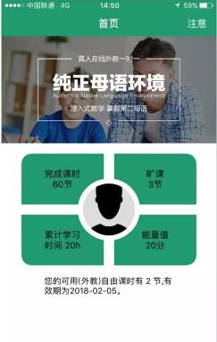 登陆之后如下图所示首页可以查询已完成课时,旷课节数,累计学习时间,能量值等基本信息。