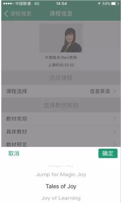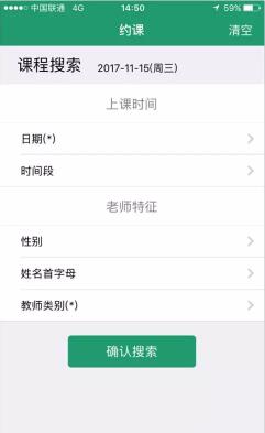 可以通过你要上课的时间和外教姓名选择预约课程,点击“确认搜索”。