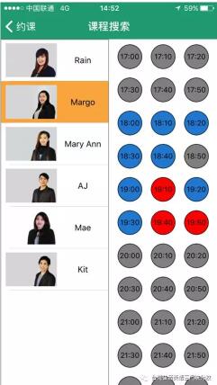 课程搜索页面可以选择外教和具体上课时间。点击蓝色【OPEN】约课时间即可约课,红色是本时段已预约满,灰色是未开课。