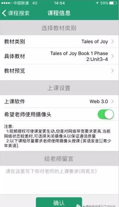 选择上课软件,推荐大家使用web3.0上课工具,更加稳定,还有视屏回放功能,如有需要提前和外教沟通的部分可以在“老师留言区”给外教留言,选课完成后点击“确认”。