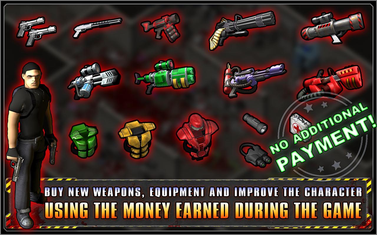 这是一款斜45°角的第三人称动作射击游戏,游戏的主要场景在黑暗阴森的军事基地里,这里已经被各种各样恐怖的怪物所占领,玩家必须拿起武器,勇敢的消灭血腥的怪物,才能取得最后的胜利哦。游戏分两种模式,过关模式和时间模式,游戏中可以获得MONEY,用作下一关购买更好的武器弹药,也可以用来升级玩家的能力值。