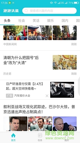 泡泡头条,看天下有趣事,赚手中零花钱,看新闻能赚钱,选择频道,认真阅读新闻即可获得金币奖励,完成任务,丰富任务让你每天赚不停,每天整点,系统会自动帮您把金币兑换成零钱。