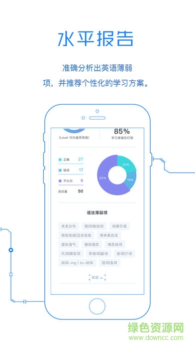 通过大数据运算,自适应调整题目,测试结果更精准;独家算法,分别定位主动词汇与被动词汇,细化用户词汇积累目标;