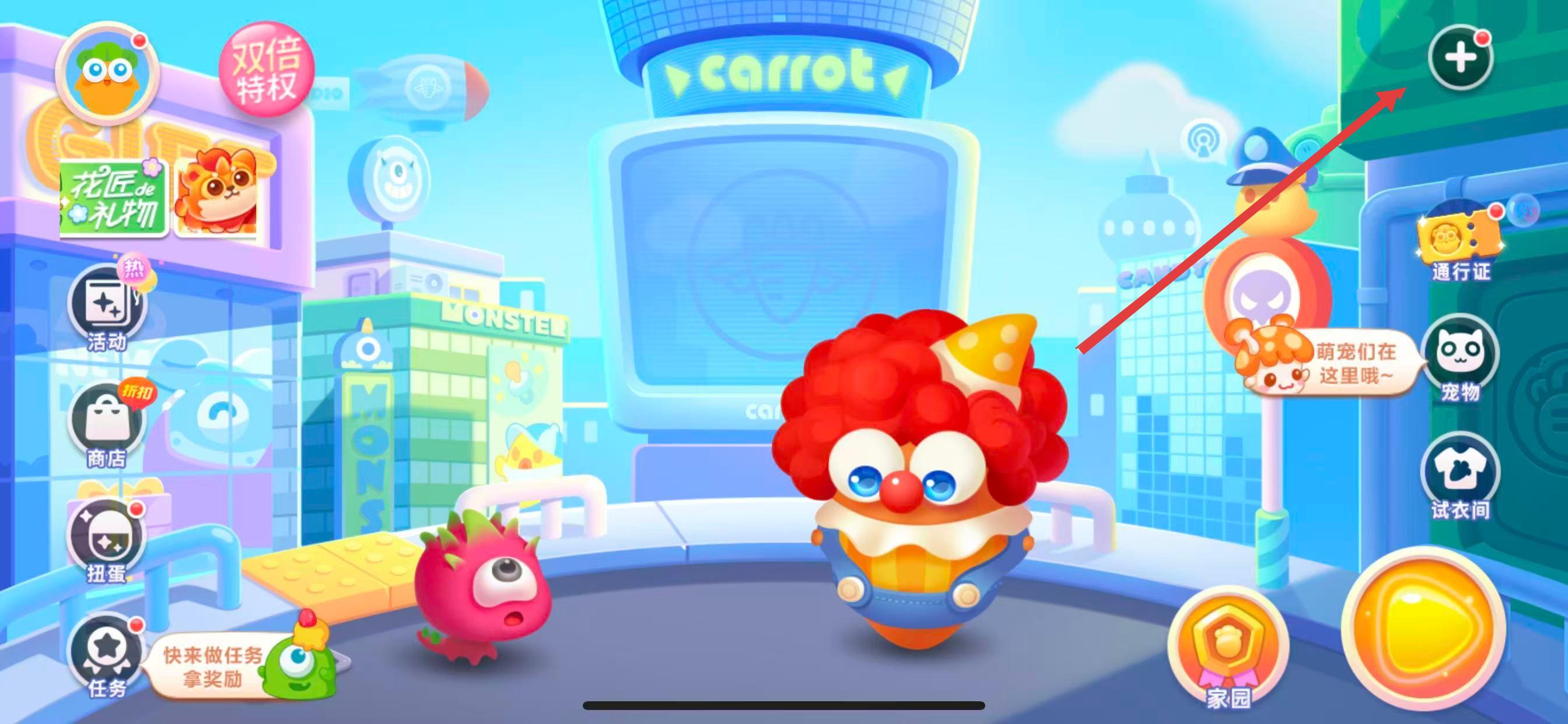 1、打开保卫萝卜3进入游戏主界面,点击右上角+号。