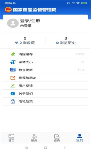 1、打开中国药品监管app,点击底部导航栏的我的选项。