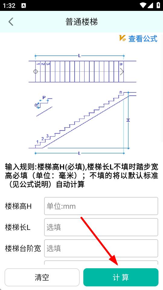 4、进入所选楼梯类型页面,根据页面提示,输入相关参数,比如楼梯高H等部分参数选填,输入完成后点击计算按钮,即可得出计算结果。
