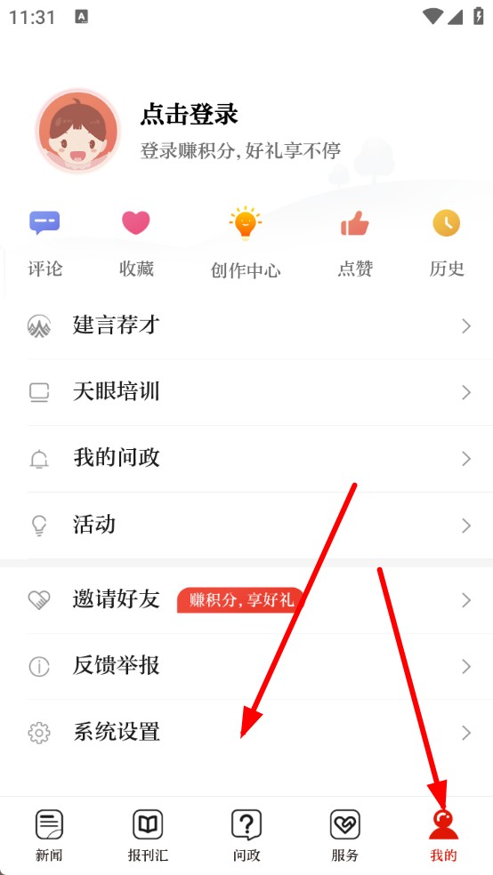 1、打开天眼新闻APP,进入我的个人页面,找到并点击系统设置选项。