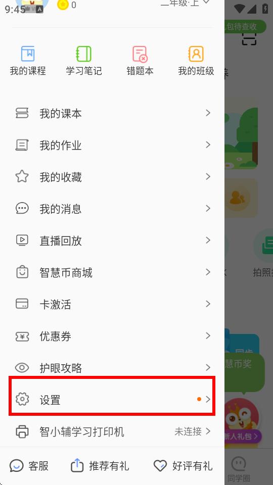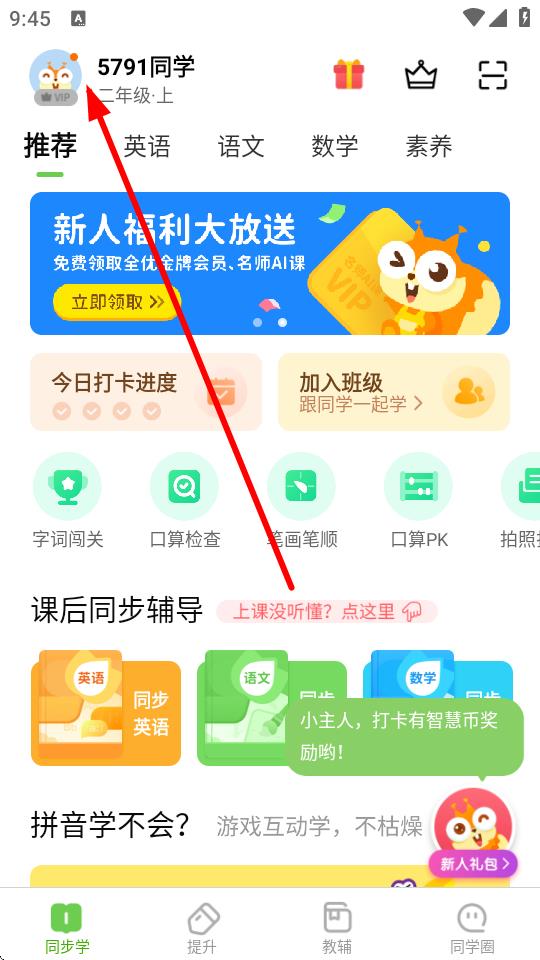 1、打开冀教app小学版,点击左上角头像位置,进入个人功能菜单界面。