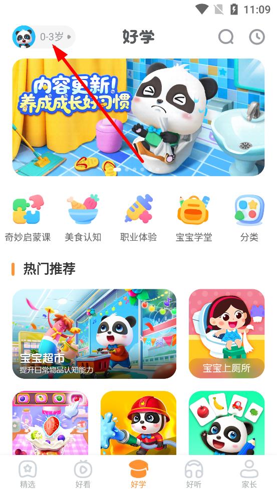 1、打开宝宝巴士应用,点击首页左上角显示年龄的区域。