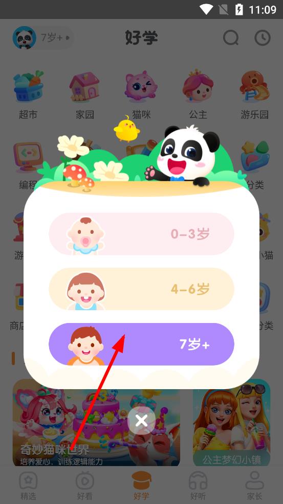 2、在弹出的年龄选择弹窗中,点击想要设置的年龄阶段按钮,如“0-3岁”“4-6岁”“7岁+”。
