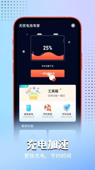无忧电池专家可以增加手机的充电速度能有效的缩短充电时间,并提供个性化的一键省电,最大程度延长电池使用时间也可以对手机进行管理垃圾清理等功能。