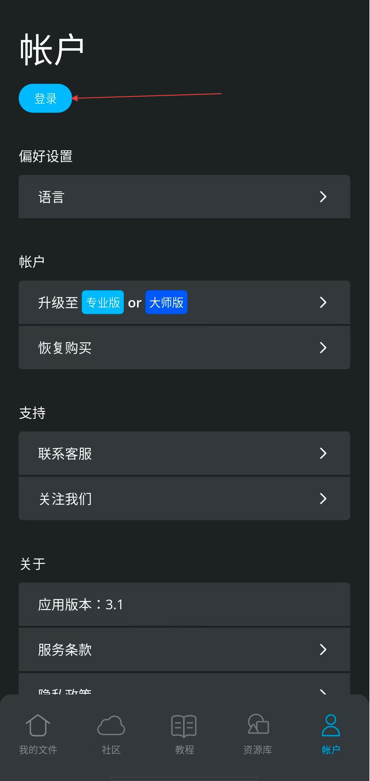 1、打开魔法人形师应用点击底部导航栏中帐户选项进入帐户页面,在页面左上角点击登录按钮,进入登录相关界面。