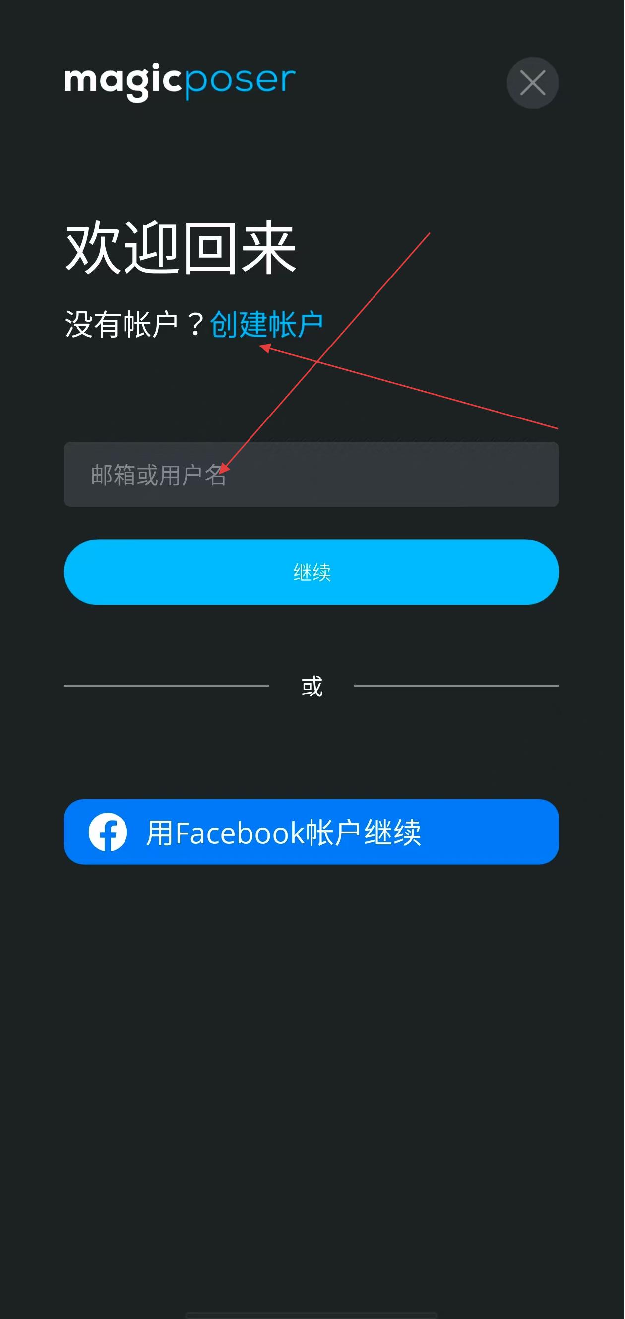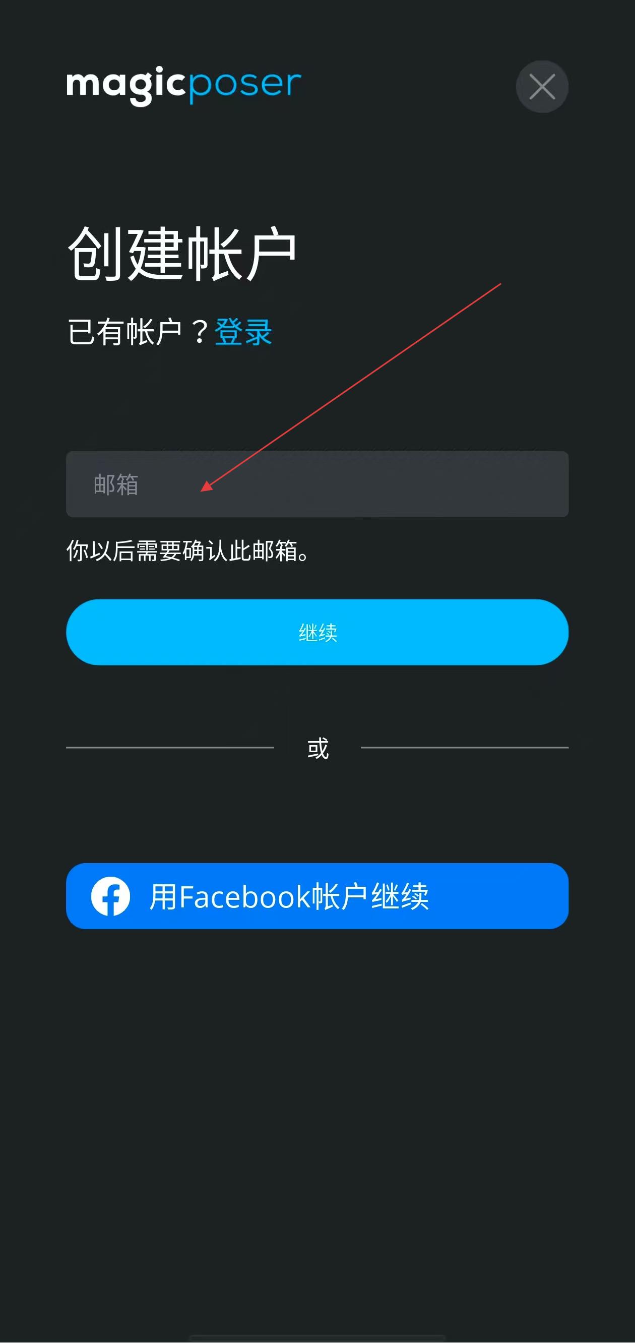3、在创建帐户页面的邮箱输入框中填写可用邮箱地址,之后点击继续按指引完成后续验证等步骤,完成帐户创建。