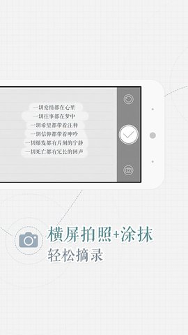读书笔记摘录神器,从此告别手抄书。用户可以拍摄书中感兴趣的内容,涂抹要摘录的文字,即可轻松记录读书笔记手机中的笔记可实时同步到云端,您可以在PC上用浏览器查看和修改笔记,不用担心您的笔记因手机损坏和遗失而丢失!