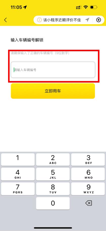 3、选择手动输入时,在输入框准确输入9位车辆编号,点击立即用车解锁车辆。