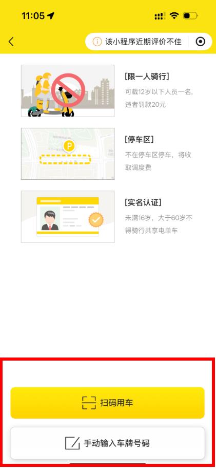 2、点击界面中的扫码用车按钮,若二维码损坏,可选择手动输入车牌号码。