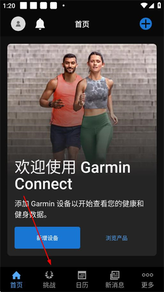 1、打开Garmin Connect,在首页点击底部导航栏的挑战选项。
