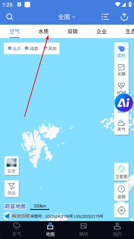 2、进入地图页面后,点击上方导航栏中的水质选项。